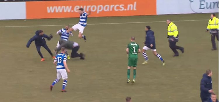 Solo sonó el silbatazo del árbitro, para que se desatara el zafarrancho. Los jugadores del Graafschap se fue a celebrar con su afición a la orilla del campo, pero los fanáticos rivales comenzaron a saltar la valla y las cosas se salieron de control.
