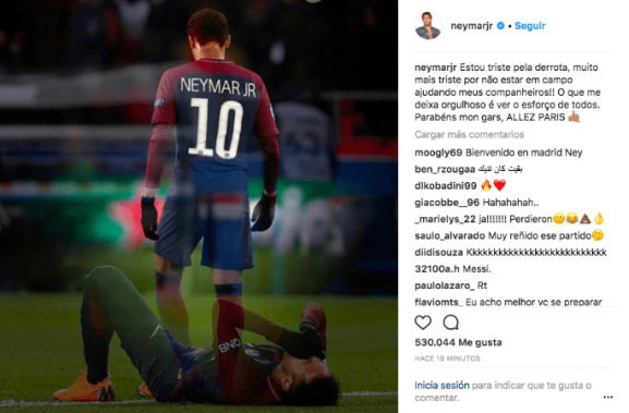 Neymar reconoció también en su mensaje sentirse «orgulloso» de ver el esfuerzo de todos sus compañeros, a los que felicitó con un «Parabéns mon gars, allez París» («Felicitaciones chicos, ánimo París»).