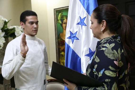 El deportista, que cursa el noveno grado en el Liceo Hondureño Japonés, practica esgrima en el Parque Vida Mejor ubicado en la colonia El Hogar. El día de ayer fue juramentado por la primera dama, Ana García de Hernández, quien le deseó éxitos y que represente dignamente a Honduras.