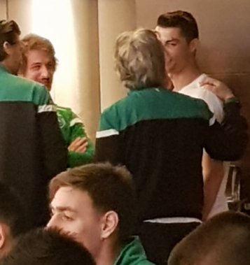 Cristiano Ronaldo luego de marcar un doblete a la Juventus, con chilena incluido, visitó el hotel de concentración del Sporting de Lisboa, club donde se formó, previo al partido que sostendrán ante el Atlético de Madrid en España.