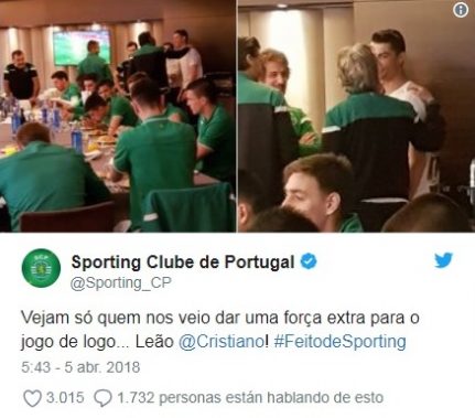 Ha sido el mismo equipo portugués que ha compartido en su cuenta de Twitter, dos imágenes con un texto, en el que explica que Ronaldo se pasó por el hotel para «dar una fuerza extra» a la plantilla verdiblanca antes del partido en el Wanda Metropolitano.