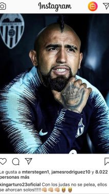 El volante chileno ha publicado una fotografía en Instagram de él en la banca con un mensaje muy polémico: «Con los Judas no se pelea, ellos se ahorcan solos». Aunque luego borró la imagen.