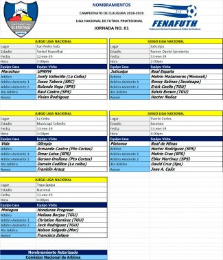 La Comisión Nacional de Arbitraje nombró las ternas arbitrales para la jornada inaugural del torneo de Clausura 2019 que arranca hoy sábado. La novedad es la presencia de Melissa Borjas Pastrana quien por tercera vez dirigirá un partido de Liga Nacional, entre Motagua y Honduras Progreso.