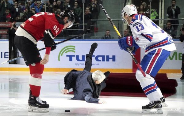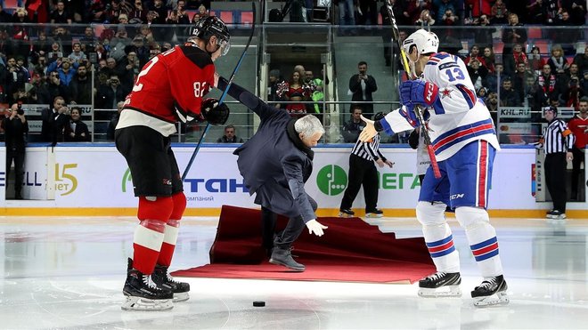 Este lunes fue invitado para hacer el saque inicial del partido entre el Avangard local y el SKA de San Petersburgo, de la Liga Continental de Hockey.