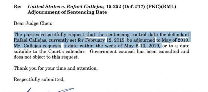 Callejas tendría que presentarse el martes 12 de febrero a los tribunales de Nueva York, para conocer la condena de su delito. Pero, este viernes su cuerpo de abogados solicitó al juez que lleva su caso, aplazar la fecha para el 6 o 10 de mayo.