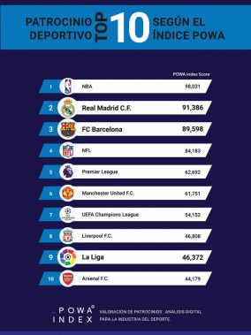 El índice POWA valora las entidades según lo que ingresan en patrocinio deportivo en tiempo real. En su ranking, el mejor equipo y más valiosos es el Real Madrid, que supera a su eterno rival, el Barcelona y también a una entidad como es la liga española.