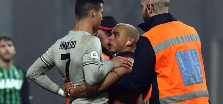 Durante el partido entre Sassuolo y Juventus que ganó la «Vecchia Signora» por 3-0, un aficionado, sin camiseta, ingresó al campo para abrazar al crack portugués Cristiano Ronaldo.
