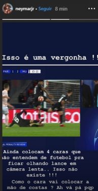 Neymar, estalló por la polémica jugada del penal por una mano dePresnel Kimpembe sobre el final del partido. «Es una vergüenza», escribió en una historia de Instagram.