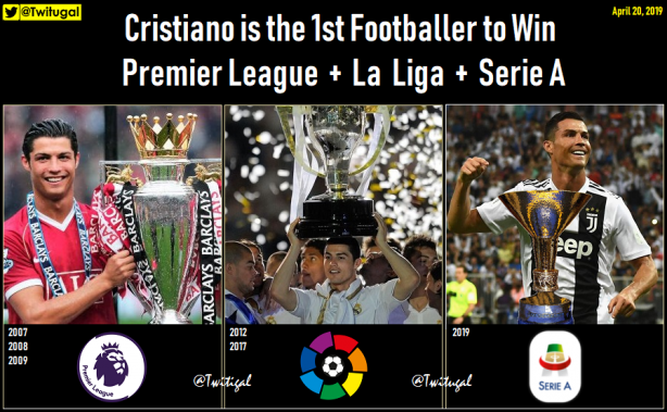 Cristiano Ronaldo se consagró campeón de la Serie A con Juventus y es el primer jugador en salir campeón de la Seria A de Italia, la Liga de España y la Premier League consiguiendo seis títulos ligueros en total.