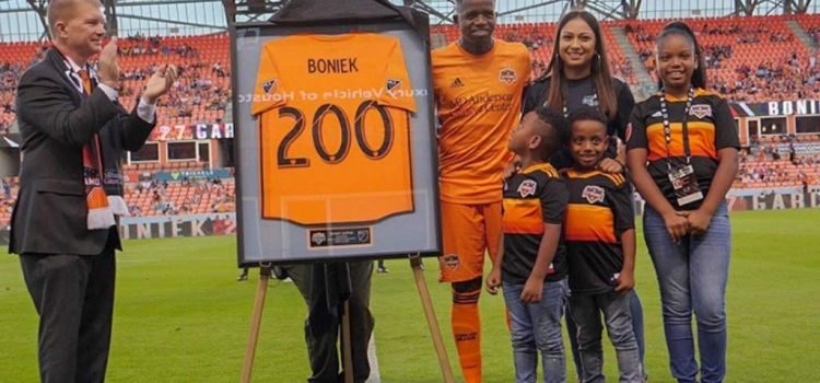 Boniek recibió una camiseta con el número 200 por los partidos que ha disputado con el equipo naranja. El homenaje se hizo previo al encuentro disputado en el BBVA Compass por la jornada seis de la Conferencia del Oeste en la MLS, donde fue titular al igual que sus compatriotas Maynor Figueroa y Alberth Elis, quien dio el pase del primer gol.