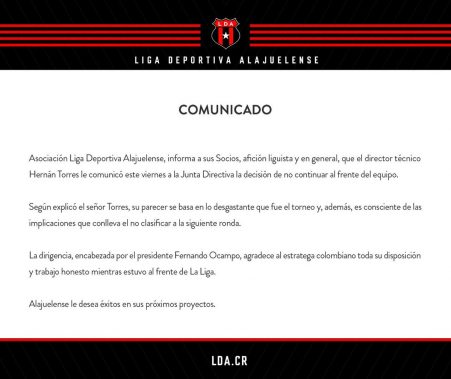 «Asociación Liga Deportiva Alajuelense, informa a sus socios, afición liguista y en general que el director técnico Hernán Torres le comunicó este viernes a la junta directiva la decisión de no continuar frente al equipo», dice el comunicado.
