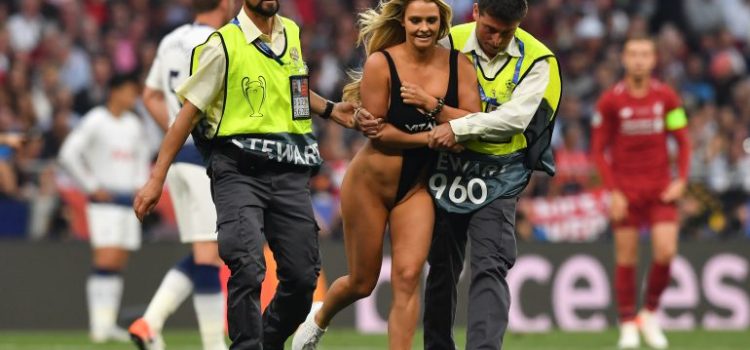 El partido se detuvo al minuto 17 por la presencia de una bella aficionada vestida en traje de baño negro, que saltó desde la tribuna y corrió hasta la mitad de la cancha donde la seguridad logró capturarla y retirarla. Luego de los abucheos del público por la demora se reanudó la final que ganó el Liverpool 2-0 al Tottenham.