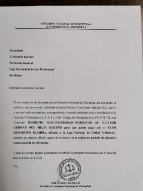 La Comisión Nacional de Disciplina ddecidió habilitar a los futbolistas Jhow Benavidez y German Mejía quienes estuvieron suspendidos por dos juegos. «Patón» Mejía podrá jugar el clásico capitalino frente a Motagua mañana domingo en el estadio Olímpico de San Pedro Sula.