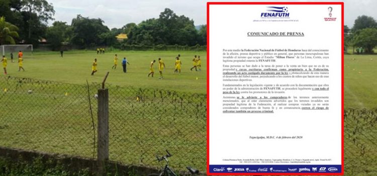 La Fenafuth denunció que los terrenos donde se ubica el estadio Milton Flores de La Lima, Cortés, han sido invadidos por personas desconocidas, mismas que han puesto en venta dichos terrenos y el organismo emitió un comunicado donde informa las medidas que tomará.