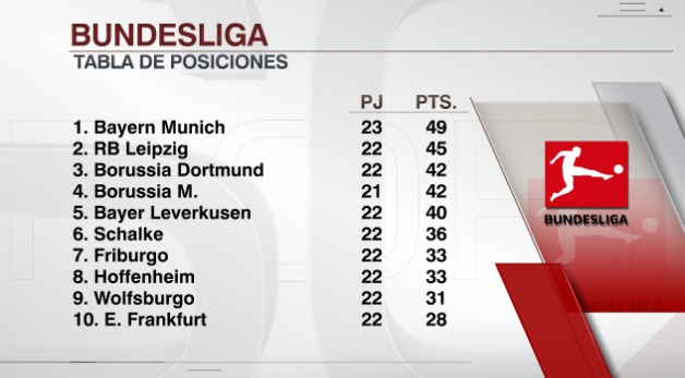 Con 49 puntos, el Bayern se destaca ahora con cuatro más que el RB Leipzig (2º), que recibe ahora una dosis de presión y que necesita ganar en la cancha del Schalke 04 (6º) para poder volver a ponerse a uno de los muniqueses.