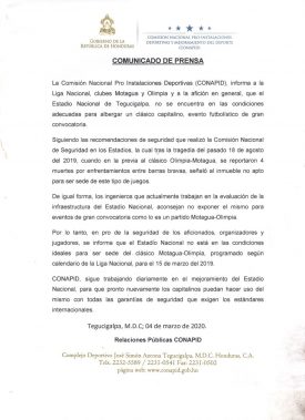 A inicios de la semana las directivas de Olimpia y Motagua, recibieron la autorización de la Liga Nacional, Comisión de Seguridad, CONAPID y Copeco para que se puedan disputar su partido de la segunda vuelta en el estadio Nacional de Tegucigalpa, pero con esta nueva notificación de la Conapid, deberán de seguir jugando los clásicos fuera de la capital.