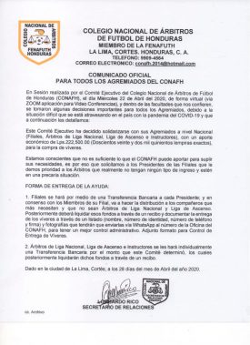 El Colegio Nacional de Árbitros de Fútbol de Honduras (CONAFH) aportó 222, 500 lempiras que serán destinado para ayudar a sus afiliados, afectados por la suspensión de los torneos locales a causa del nuevo coronavirus.