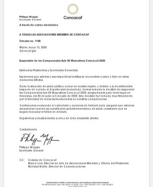 La Concacaf ha suspendido oficialmente este miércoles el Premundial Sub-20 que se iba a disputar entre junio y julio en la ciudad de San Pedro Sula, ante la pandemia del coronavirus.