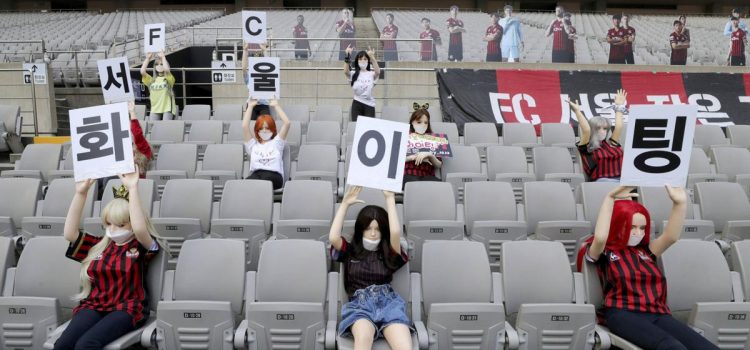 In a photo taken on May 17, 2020 mannequins are displayed at a FC Seoul football match in Seoul. – South Korean football club FC Seoul apologised May 18, 2020 after reports that it had used sex dolls to fill up its empty stands during a game at the weekend. (Photo by – / YONHAP / AFP) / – South Korea OUT / REPUBLIC OF KOREA OUT NO ARCHIVES RESTRICTED TO SUBSCRIPTION USE
