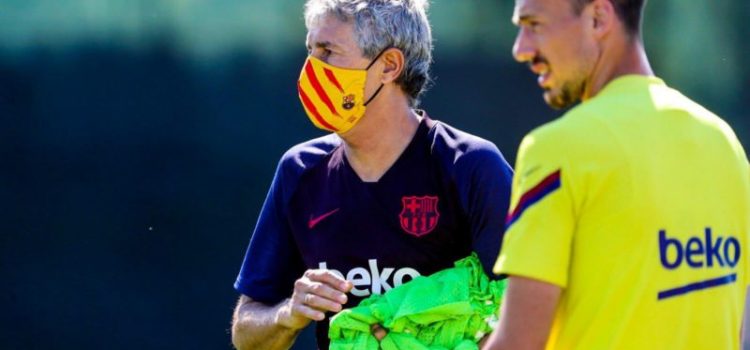 La plantilla del Barcelona volvió a ejercitarse este martes en la Ciudad Deportiva Joan Gamper con la ayuda del cuerpo técnico, que lució por primera vez las mascarillas protectoras oficiales del club que salieron a la venta el lunes.