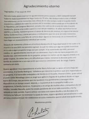 «Por este medio deseo expresar mi agradecimiento primeramente a Dios todopoderoso por haberme dado la posibilidad de llegar hasta mis 79 años. Me dediqué toda la vida a trabajar honradamente y en los momentos más críticos de mi vida siempre recibí el respaldo moral, económico de todos los sectores de la sociedad, comenzando por el presidente de la Repúblic y del Congreso Nacional, sumado de las cadenas de oración de todo el pueblo hondureño, gracias a las cuales superé la crisis del pie diabético», escribió en el primer párrafo.