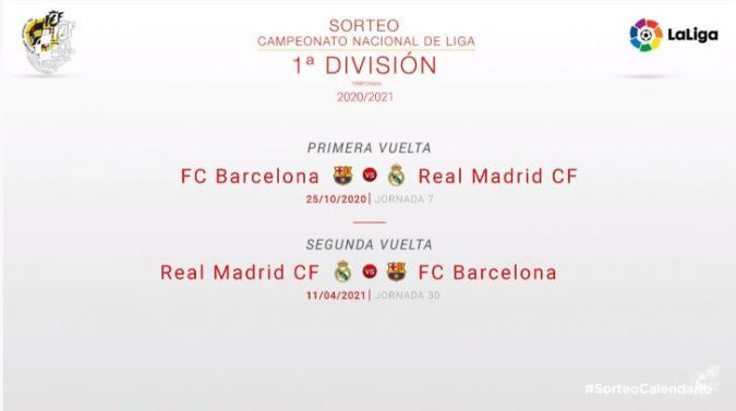 La Liga de España terminará el 23 de mayo de 2021. El clásico Barcelona-Real Madrid del Camp Nou se jugará el 25 de noviembre. La vuelta el 11 de abril en el Santiago Bernabeu (en el mejor de los casos, si no será en el Alfredo Di Stéfano).