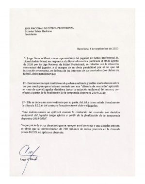 “Tal y como señala literalmente la cláusula 8.2.3.6 del contrato firmado entre el club y el jugador, esta indemnización (los 700 millones de euros de su cláusula de rescisión) no se aplicará cuando la resolución del contrato por decisión unilateral del jugador tenga efectos a partir de la finalización de la temporada deportiva 2019-2020”, explica Jorge Messi en una carta dirigida a Javier Tebas, presidente de la Liga de Fútbol Profesional.