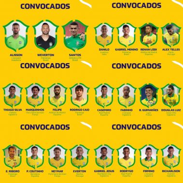 Delanteros: Gabriel Jesus (Manchester City-GBR), Rodrygo (Real Madrid-ESP), Neymar (Paris Saint Germain-FRA), Everton (Benfica-POR), Roberto Firmino (Liverpool-GBR) y Richarlison (Everton-GBR).