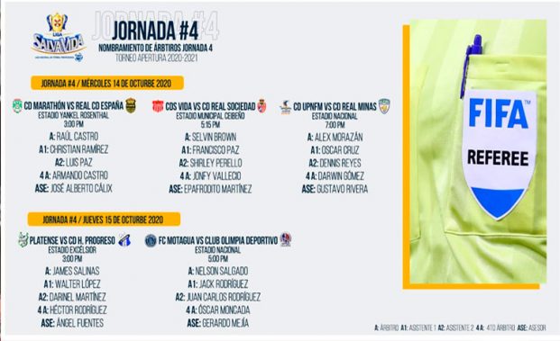 La Comisión Nacional de Arbitraje (CNA) que preside Óscar Velásquez confirmó este martes las cuartetas arbitrales para los encuentros de la jornada cuatro del torneo Apertura 2020-2021, que tendrá como atractivos los dos clásicos entre Marathón-Real España y Motagua-Olimpia.