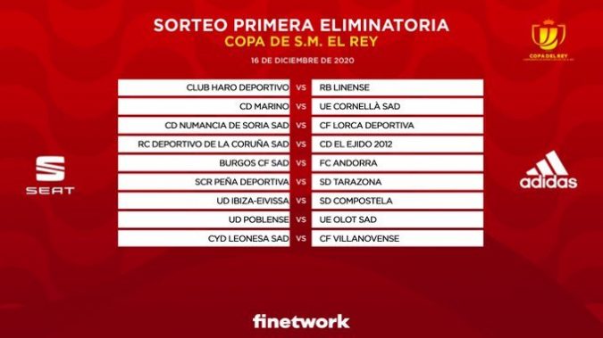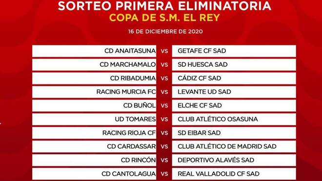 Ya quedaron definidos los enfrentamientos de la primera eliminatoria de la Copa del Rey, que se disputará a partido único el miércoles 16 de diciembre, según ha deparado el sorteo celebrado este lunes en el Estadio de La Cartuja de Sevilla.