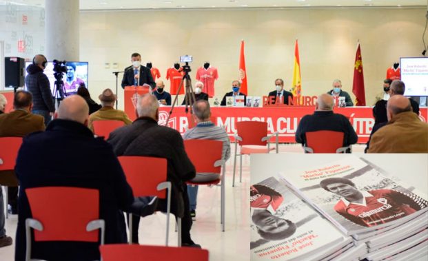 Dirigentes, exjugadores y aficionados del Murcia acudieron al palco de honor del Estadio Enrique Roca para participar en la presentación del libro homenaje al hondureño José Roberto «Macho» Figueroa escrito por Antonio Barceló.