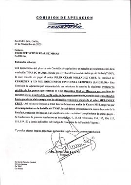 La Comisión de Apelaciones de la Federación de Fútbol de Honduras determinó que el Real de Minas perdería puntos para sus siguientes partidos por incumplir una resolución del Tribuna Nacional Arbitral del Fútbol (TNAF).