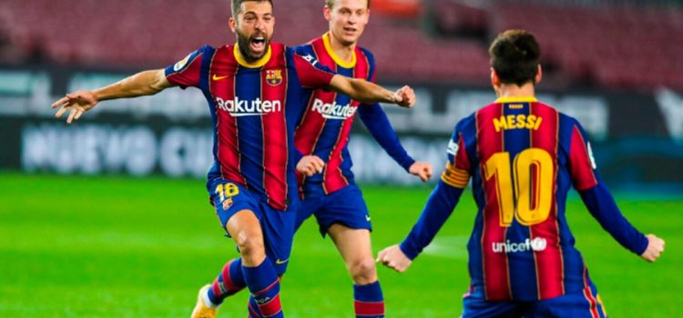 Pero los azulgranas respondieron tan solo cuatro minutos más tarde (30) con un disparo con la pierna derecha de Jordi Alba, tras un rebote en el área, que se clavó en un ángulo y dejó paralizado al arquero Alex Remiro.