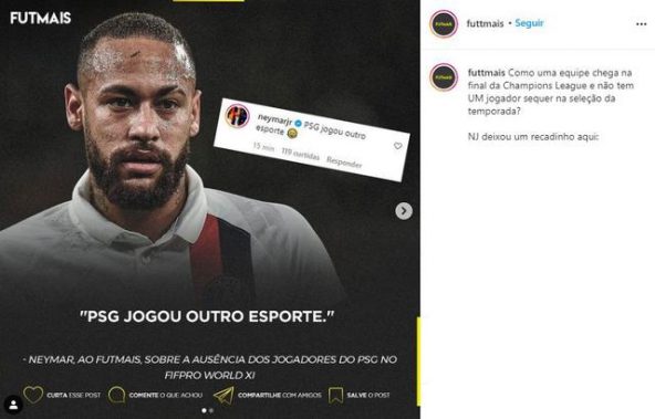 El club parisino ganó la Ligue 1 y alcanzó la final de la Champions League en la pasada temporada, por lo que el paulista esperaba ver a alguno de sus compañeros en el equipo ideal. Sin embargo, ningún jugador del campeón francés alcanzó los votos necesarios para ser reconocido por la FIFA.