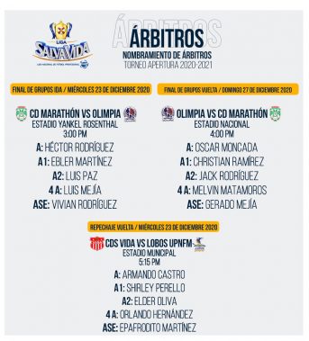 Mientras que para el duelo de vuelta entre Vida y Lobos, pactado para jugarse este miércoles 23 a las 5:00 de la tarde en la ciudad de La Ceiba, el encargado de impartir justicia será el silbante Armando Castro, y los asistentes son, Chirley Perelló y Elder Oliva y como cuarto Orlando Hernández.