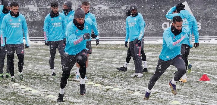 El entrenamiento en la Ciudad Real Madrid estuvo marcado por la nieve que no cesó de caer en el tiempo que estuvieron los jugadores en el terreno de juego. Pese al esfuerzo de los operarios para que el césped estuviese en las mejores condiciones, una capa fina de nieve acompañó el trabajo de poca intensidad de la última sesión.