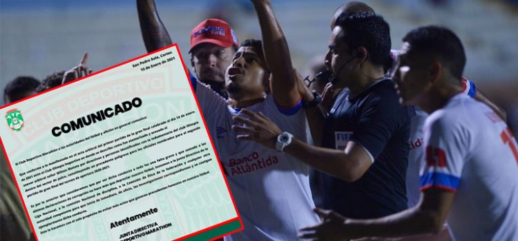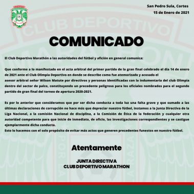 “Que conforme a lo manifestado en el acta arbitral del primer partido de la gran final celebrado el día 14 de enero de 2021 ante el Olimpia en donde se describe como fue atemorizado y acosado el asesor arbitral señor Wilson Matute por directivos y personas identificadas con la indumentaria del Olimpia dentro del sector de palco, constituyendo un precedente peligroso para los oficiales nombrados para el segundo partido de gran final del torneo Apertura 2020-21”, inicia el comunicado.