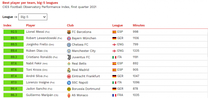 Confirmadas las sensaciones que ha dejado Leo Messi durante los tres primeros meses de 2021. Según un informe de CIES Football Observatory, donde se ha comparado todas las actuaciones de los futbolistas durante estos meses, el capitán es el más valorado. Este estudio analiza las actuaciones en las ligas domésticas independientemente de la posición que ocupen los jugadores en el campo.