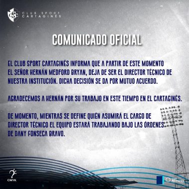 El Club Sport Cartaginés de Costa Rica ha oficializado este lunes que el entrenador Hernán Medford queda fuera de la dirección técnica del equipo de la primera división y donde milita el delantero hondureño Roger Rojas.