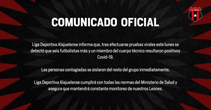 El club comunicó el caso pero no dio a conocer el nombre de los afectados, solo informaron que ya se tomaron las medidas de bioseguridad. «Las personas contagiadas se aislaron del resto del grupo inmediatamente. Liga Deportiva Alajuelense cumplirá con todas las normas del Ministerio de Salud y asegura mantendrá constante monitoreo de nuestros Leones», se lee en el comunicado.