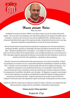 El expresidente del equipo Vida de la ciudad de La Ceiba, Roberto Dip, a través de una carta que hizo pública se despidió del club y de los miles de aficionados rojos, después de 20 años de gestión.
