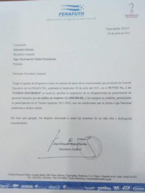 «Tengo el agrado de dirigirme a usted, en ocasión de hacer conocimiento que en sesión de Comité Ejecutivo de la Fenafuth, celebrada el miércoles 28 de julio del 2021, en el Punto n. 2 de «otros informes» se resolvió, aprobar la suspensión de la obligatoriedad de presentación de garantía bancaria de un millón de lempiras (L.1,000,000.00), a los equipos no estables, permitiendo su participación en el torneo Apertura 2021-22, con las condiciones que la propia Liga Nacional establezca a dichos clubes», indica el escrito de la Fenafuth.