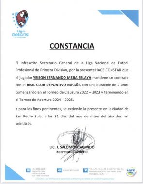 El presidente aurinegro Elías Burbara tiene un escrito que lleva la firma del secretario Salomón Galindo adjunta que el jugador tiene contrayo vigente hasta el torneo Apertura 2024-2025.