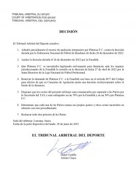 El Tribunal de Arbitraje del Deporte Resolvió: “Admitir parcialmente el recurso de apelación interpuesto por Platense FC contra la decisión dictada por la Federación Nacional de Fútbol de Honduras de fecha 26 de diciembre del 2022”, dice el primer inciso del documento.