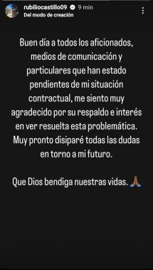 ”Buen día a todos los aficionados, medios de comunicación y particulares que han estado pendiente de mi situación contractual, me siento muy agradecido por su respaldo e interés en ver resuelta esta problemática. Muy pronto disiparé todas las dudas en torno a mi futuro”, escribió Rubilio Castillo en su Instagram.