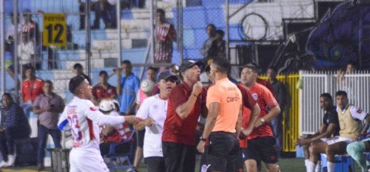 Los jugadores Michaell Chirinos y Brayan Beckeles trataron de calmar a su entrenador ya que estaba muy molesto por la decisión del silbante, que lo hace ausentarse del banquillo en el próximo compromiso, el clásico ante Motagua.