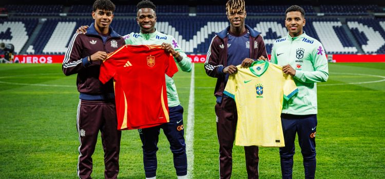 “Una misma piel”, es el lema bajo el que se presenta un amistoso que une a Brasil y España en la lucha contra el racismo. Cuatro de sus estrellas, los brasileños ‘Vini’ y Rodrygo junto a los españoles Yamal y Nico Williams, posaron en una imagen que dará la vuelta al mundo.