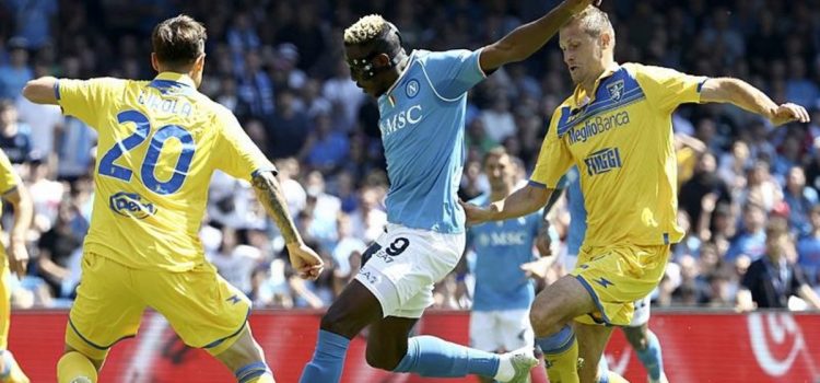 Con un zurdazo de Matteo Politano en el minuto 17 abrió el marcador el conjunto local. Era muy superior el Nápoles y el Frosinone lo sabía. Osimhen tuvo en el minuto 20 el 2-0 en sus pies, pero en el uno contra uno frente Turati, arquero del Frosinone, erró de manera clamorosa. Fue entonces que todo parecía dado para los locales cuando ni de penal pudo convertir Matías Soulé, ya que le adivinó el tiro Meret, que luego pasó de ser héroe a villano.