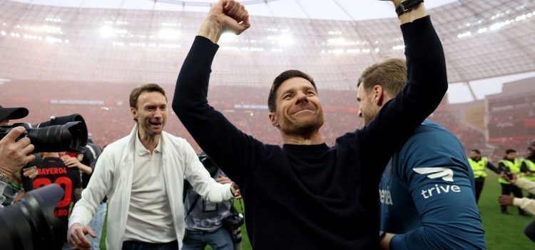 Xabi Alonso celebró por todo lo alto la consecución de la primera Bundesliga de la historia del Bayer Leverkusen, lo que le convierte en el tercer técnico español que consigue el título en las grandes ligas europeas tras Pep Guardiola y Unai Emery.