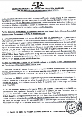 Finalmente, se le impuso una multa de 10 mil lempiras al Génesis en el juego ante Olancho porque la afición de Comayagua quemó bengalas en las graderías del estadio Carlos Miranda.